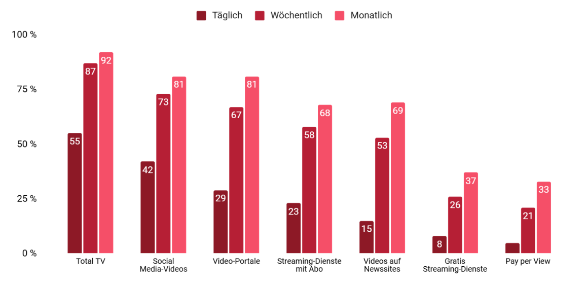 Die Schweiz ist ein absolutes Bewegtbild-Land, das macht die Studie klar. Nur 3% aller Befragten gaben an, keine Bewegtbildmedien zu konsumieren. Von den restlichen 97% gaben die meisten an, ihre Serien, Filme, Dokus oder Sportsendungen im TV zu schauen. Damit liegt TV – sowohl in der täglichen, wöchentlichen und monatlichen Nutzung – deutlich vor Social Media, Videoportalen wie YouTube und Streamingdiensten mit oder ohne Abo.