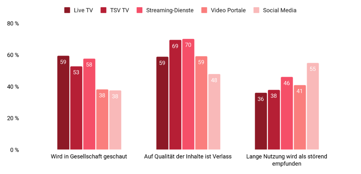 Zudem ist TV sozial, qualitativ und unverzichtbar. Deutlich über die Hälfte der Studienteilnehmenden schaut TV in Gesellschaft (59% Live, 53% im TSV) – bei Social Media und Videoportalen wie YouTube liegen diese Werte mit je 38% deutlich tiefer. Ebenfalls wird dem TV eine hohe Qualität seiner Inhalte zugesprochen. Insbesondere die Inhalte im zeitversetzten Fernsehen haben die höchste empfundene Qualität aller abgefragten werbegetriebenen Bewegtbild-Medien. Und auf die Frage, ob es sie störe, wenn sie zu lange auf einem der Kanäle hängen blieben, war dies sowohl bei Live TV als auch TSV bei nur knapp 40% der Befragten der Fall, bei den Streamingdiensten schon bei 46% und bei Social Media sogar bei 55%.