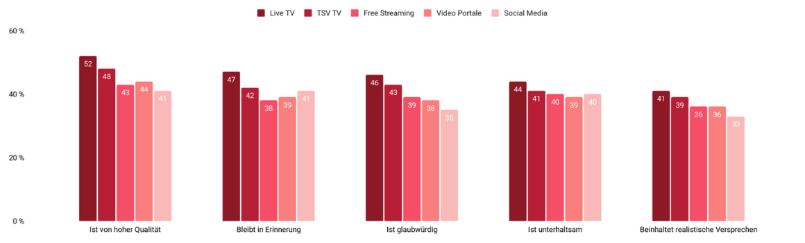 Für eine erfolgreiche Kampagne ist nicht nur die Reichweite und das Umfeld wichtig, sondern auch, ob und wie die Werbebotschaft wahrgenommen wird. In der Studie wurden die Teilnehmenden deshalb aufgefordert, die Werbung auf den verschiedenen Kanälen nach Aspekten wie Qualität, Glaubwürdigkeit etc. zu beurteilen. Die Ergebnisse machen klar: Werbung im Live TV und im zeitversetzten TV wird sehr positiv wahrgenommen.
