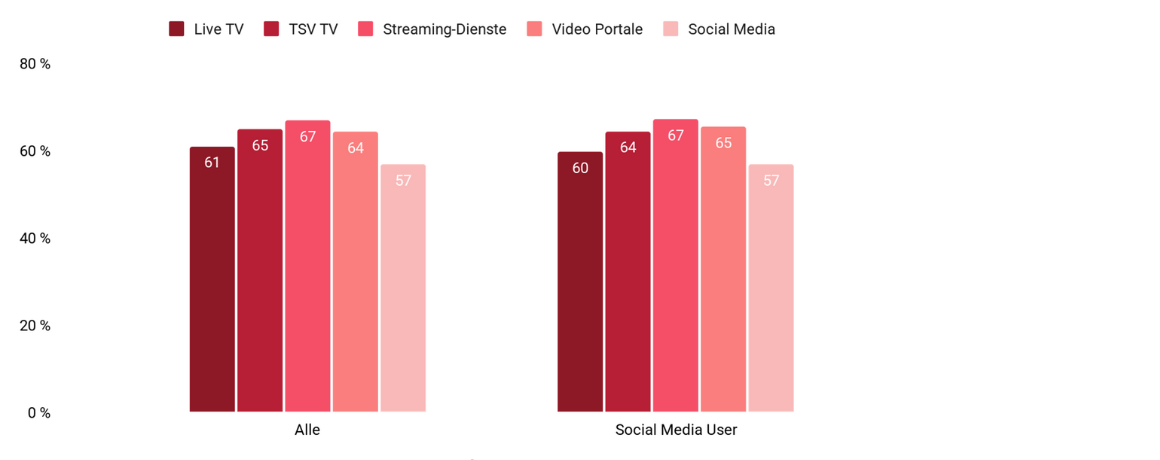 52% der Teilnehmenden finden, dass Werbung im Live TV von hoher Qualität ist (48% bei zeitversetztem TV). Damit liegt TV vor den (kostenlosen) Streamingdiensten (43%), den Videoportalen (44%) sowie Social Media (41%). Dasselbe gilt für die Werbeerinnerung (live 47%, zeitversetzt 42%), die Glaubwürdigkeit (live 46%, zeitversetzt 43%), die Unterhaltsamkeit (live 44%, zeitversetzt 41%) oder das Vertrauen in TV-Werbung (live 41%, zeitversetzt 39%).