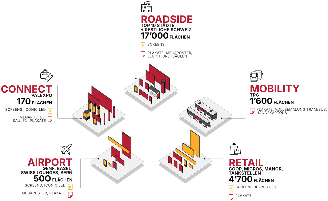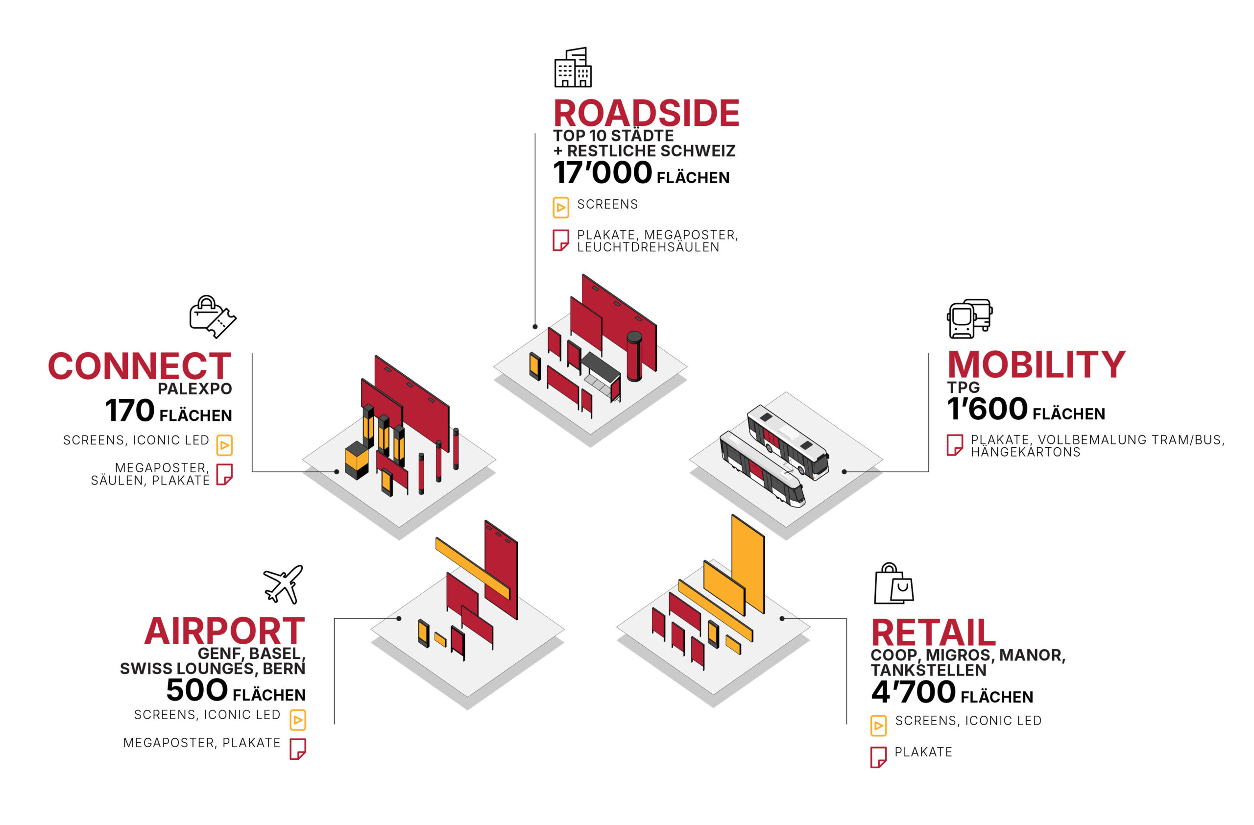 Menschen sind unterwegs – auf dem Weg zur Arbeit, beim Shoppen und in der Freizeit. Damit deine Werbebotschaft von allen Zielgruppen gesehen wird, bespielt unser OOH-Angebot (Out of Home) tausende Werbeflächen schweizweit. Dazu gehören unter anderem klassische Plakate, Screens und Sonderwerbeformen wie Megaposter. Neben hochfrequentierten urbanen Gebieten und Städten wie Zürich, Genf, Bern, Basel, Luzern, Winterthur, St. Gallen, Lausanne oder Locarno kannst du deine Aussenwerbung bei uns auch an den Flughäfen Genf, Basel, Bern-Belp und Zürich platzieren. Dazu kommen Tankstellen und verschiedene Möglichkeiten direkt am Point of Sale. So erreichst du wöchentlich Millionen von Menschen mit deiner Werbebotschaft.