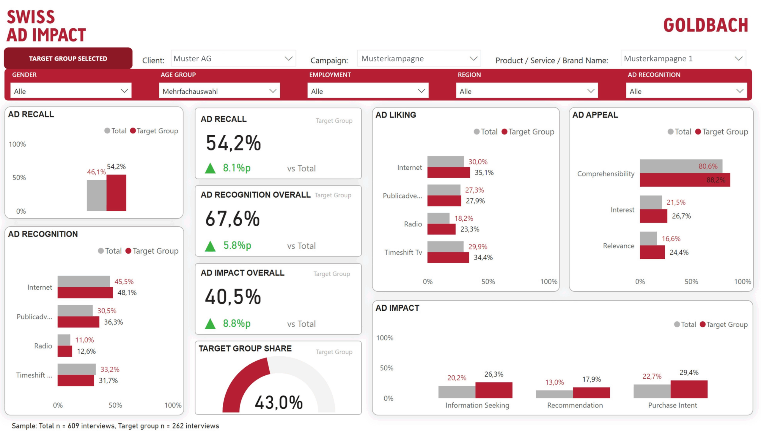 Du möchtest wissen, ob deine Kampagne die gewünschte Wirkung erzielt? Dafür haben wir zusammen mit intervista Swiss Ad Impact entwickelt. Mit diesem Angebot erhältst du im Nachgang zu deiner Werbekampagne eine Studie, welche die Werbewirkung auf einen Blick und über alle Kanäle (Goldbach- und Fremdinventar) aufzeigt.